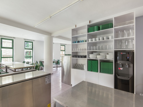 En la primera planta se encuentran la recepción, el comedor, la cocina y una sala de entretenimiento.